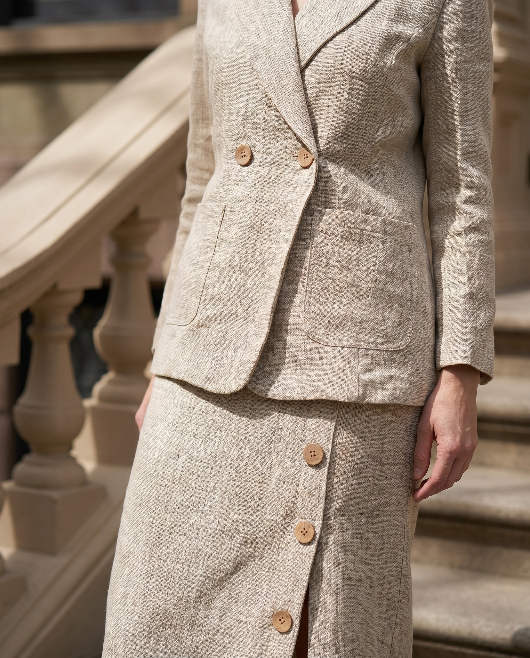 Hemp is a highly durable, breathable plant fiber known for its low environmental impact, while hand-spun cotton adds softness and thermal comfort, making the fabric suitable across seasons.