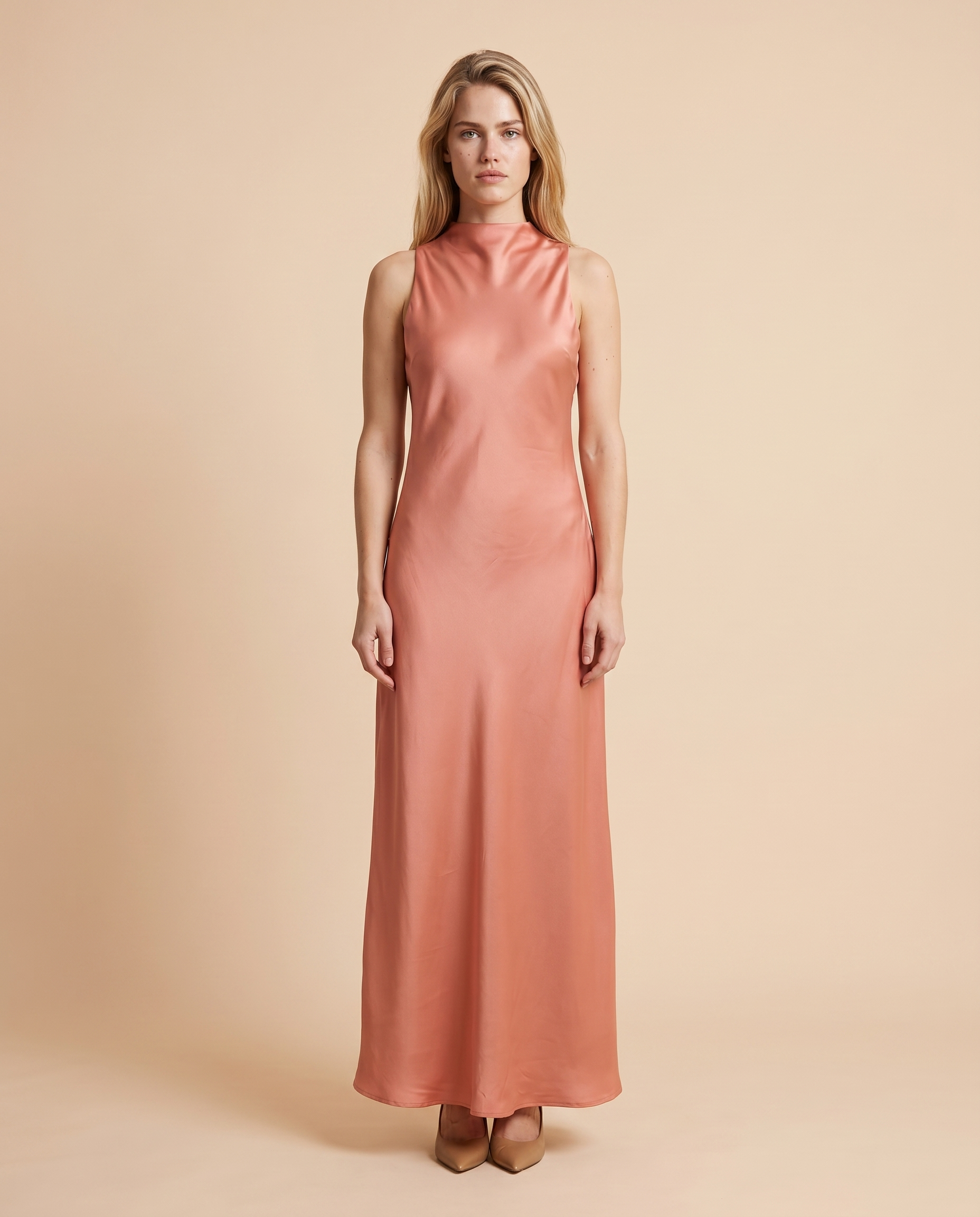 Designed with a high crew neckline and a clean, elongated silhouette.