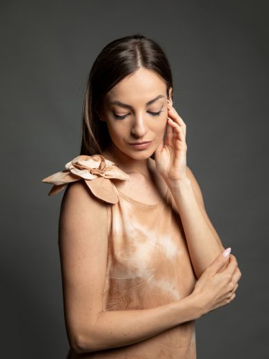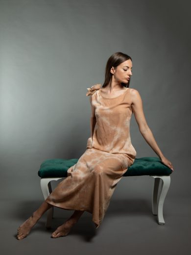 Our dress is available in two sophisticated variants of Orange Fiber: