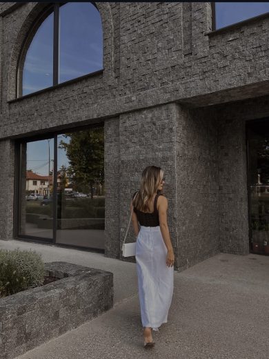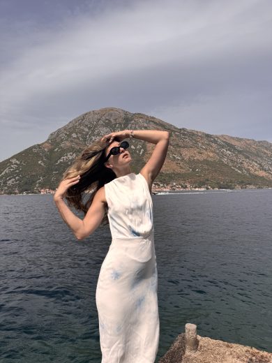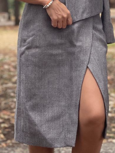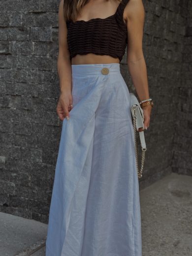 Classic white wrap dress with a flexible belt made from breathable 100% Orange Fiber.